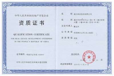 2016年,在集團(tuán)各職能部門及天潤房產(chǎn)公司的積極推動下,從集團(tuán)的戰(zhàn)略發(fā)展需求出發(fā),集團(tuán)決定由全資子公司湛江保潤投資有限公司申請房地產(chǎn)開發(fā)企業(yè)二級資質(zhì),于2016年11月21日正式獲得廣東省住房和城鄉(xiāng)建議廳頒發(fā)的“房地產(chǎn)開發(fā)企業(yè)二級資質(zhì)證書”。保潤公司獲得二級資質(zhì)以后,必將進(jìn)一步提升保潤公司在房產(chǎn)開發(fā)建設(shè)方面的專業(yè)水準(zhǔn),也將提高天潤集團(tuán)在房地產(chǎn)投資開發(fā)方面的整體實力。